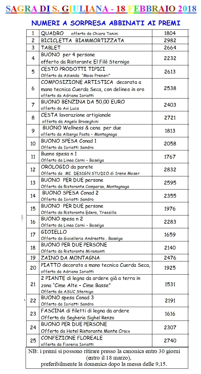 NUMERI PREMI SANTAGIULIANA2018